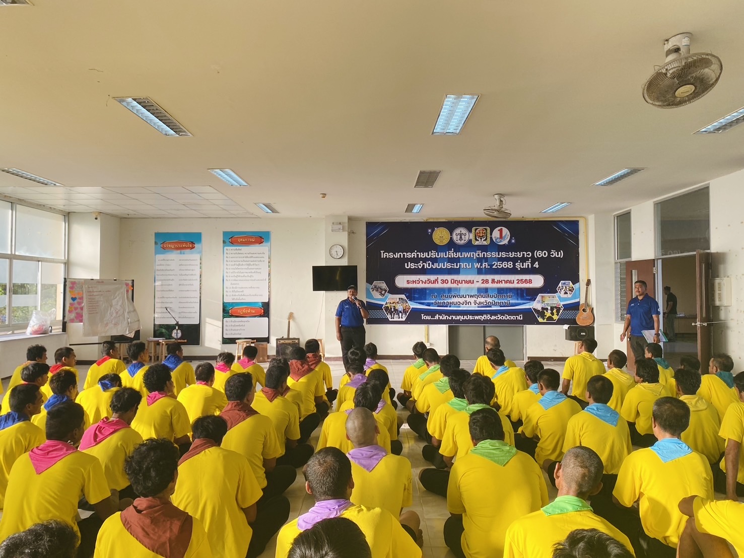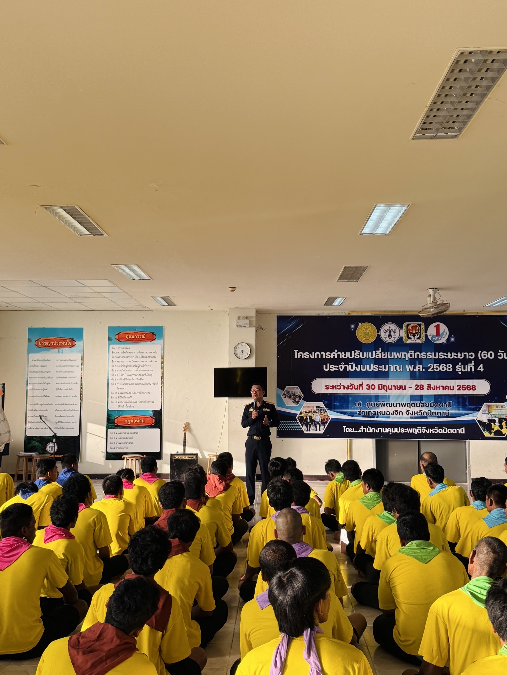 สำนักงานคุมประพฤติจังหวัดปัตตานี จัดโครงการค่ายปรับเปลี่ยนพฤติกรรมระยะยาว (60 วัน) รุ่นที่ 4 ประจำปี 2568 ผู้อำนวยการสำนักงานฯ ร่วมพบปะและให้โอวาทแก่สมาชิกผู้เข้าร่วมโครงการ